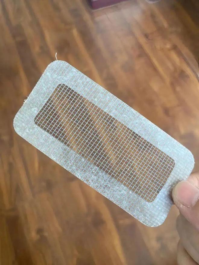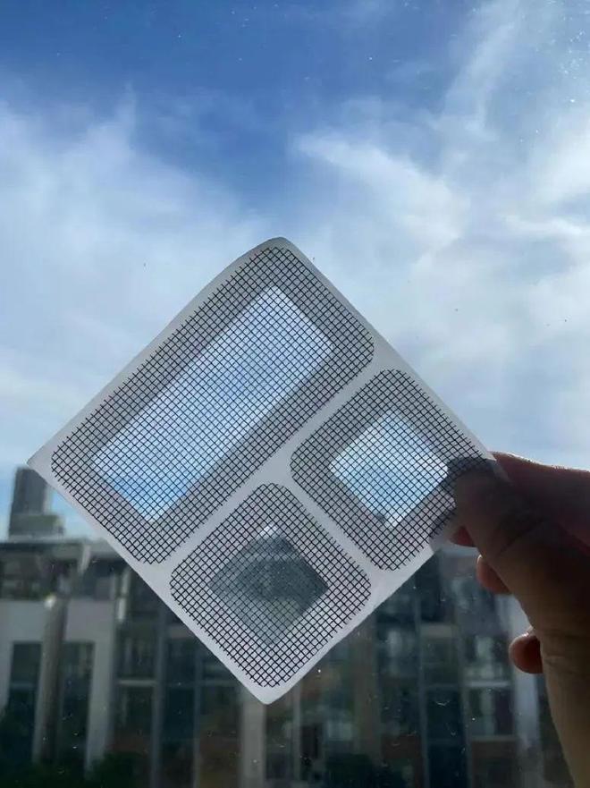 操作超级简单,这玩意儿就像大号创可贴,是透明的网格材质,自带背胶,纱窗哪里破了,剪一块贴上就行。