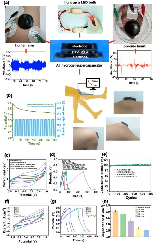图4. (a) AHSC作为能源用来点亮LED灯泡,并提供电刺激给手臂肌肉和猪心脏,以及分别获得的手臂和猪心脏电刺激的肌电图(EMG)信号。(b) AHSC的放电曲线,伴随着膝盖的运动,包括直弯状态的循环。照片展示了AHSC粘附在一位作者的膝盖上。(c) 在50 mV s−1扫描速率下的循环伏安(CV)曲线电流密度下的恒电流充放电(GCD)曲线。(e) 不同AHSCs的电容保持率与循环次数的关系。(f) 在100 mV s−1扫描速率下的CV曲线,(g) GCD曲线,以及(h)在不同拉伸条件下的电容变化。