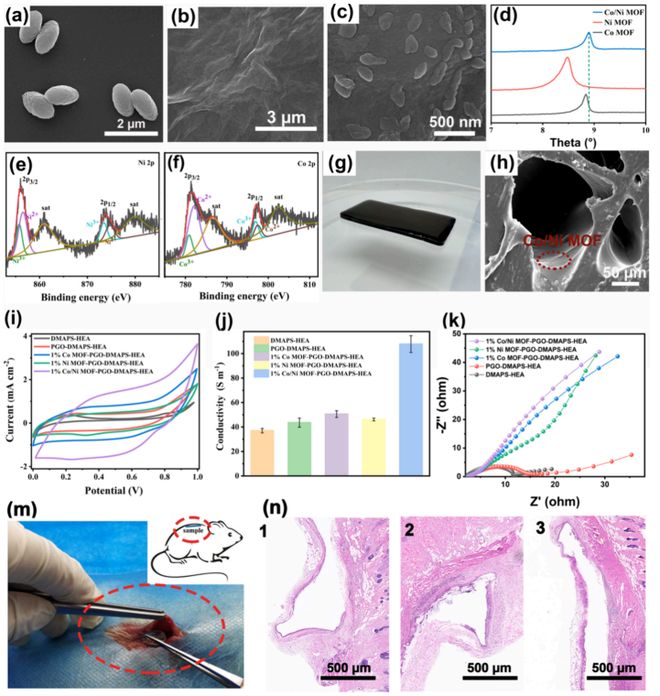 图1. 多功能Co/Ni金属有机骨架(MOF)-氧化石墨烯(PGO)-DMAPS-HEA水凝胶电极和自适应超材料水凝胶皮肤粘合剂(AHSC)的制备示意图。(a) 制备Co/Ni MOF、PGO和Co/Ni MOF-PGO-DMAPS-HEA水凝胶的步骤。放大部分显示了制备的Co/Ni MOF-PGO-DMAPS-HEA水凝胶电极的内部结构。(b) AHSC的组装结构及其多功能概述,包括高能量存储性能、优化的身体运动匹配机械性能、生物粘附和生物相容性。放大的部分截面显示了氧化还原活性纳米填料的电化学反应,包括:i. 不同氧化态的钴和镍离子之间的赝法拉第反应,有助于能量存储性能;ii. 醌和儿茶酚的动态氧化还原反应,有助于多巴胺介导的水凝胶电极的生物粘附;以及iii. 在链接结构中有效的电子转移,这是由rGO加速的。