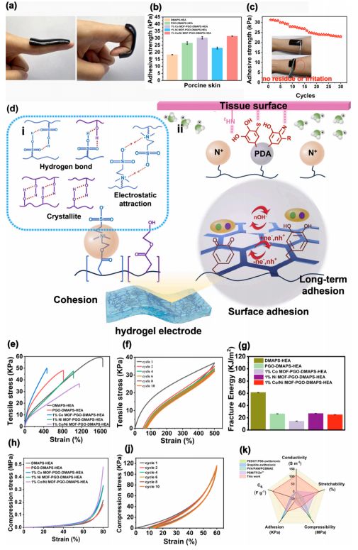 图3. (a) 水凝胶电极粘附在作者的指尖上,并与手指运动相匹配。(b) 各种水凝胶电极在猪皮上的粘附强度。(c) 水凝胶电极在皮肤组织上经过反复剥离和粘附循环后的粘附强度;插图:电极在作者手臂上的反复粘附。(d) 所制备水凝胶电极的粘附机制:i. 凝聚机制和ii. 表面粘附机制。(e) 各种水凝胶的典型拉伸应力-应变曲线。(f) Co/Ni MOF-PGO-DMAPS-HEA水凝胶电极的加载-卸载拉伸曲线。(g) 各种所制备水凝胶电极的断裂能量。(h) 各种水凝胶电极的典型压缩应力-应变曲线。(j) Co/Ni MOF-PGO-DMAPS-HEA水凝胶电极的加载-卸载压缩曲线。(k) 雷达图显示了Co/Ni MOF-PGO-DMAPS-HEA水凝胶电极的电化学性能、导电性、粘附性以及优化的拉伸性和压缩性与文献31-34中研究的材料相比的对比。
