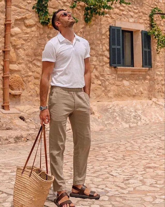 还有人喜欢把卡其裤,和T恤一块“组合”,休闲感很强。划分好身材比例,有不错的修身效果。