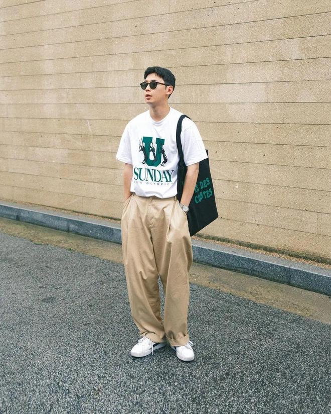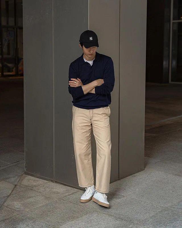 这种裤子版型选择上,那是很讲究,不喜欢太过单调。白色的T恤,将衣摆塞到裤子。至于卡其裤,会选用直筒,适合修饰大长腿。
